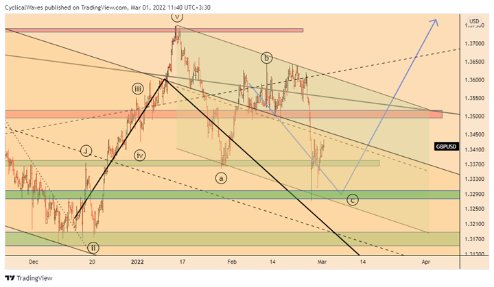 چنانچه پیشتر گفته شد، موج C نیز شکل گرفت و یک واکنش خوب داشتیم. در صورتی که قیمت از سطح 1.3615 عبور کند، اصلاح نزولی را بایستی پایان یافته تلقی کرد.