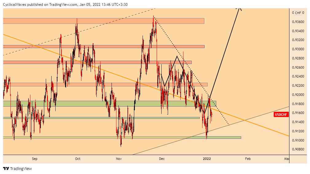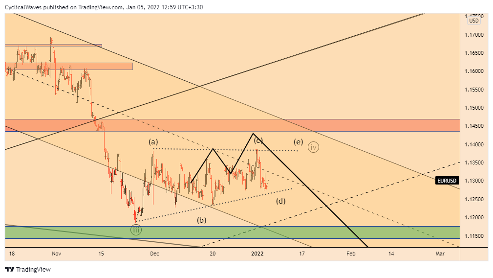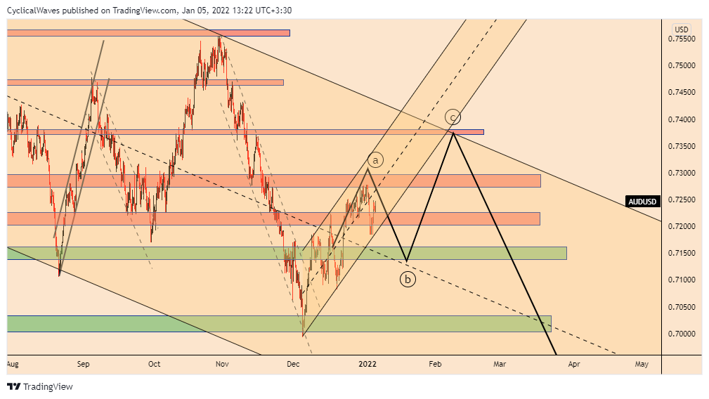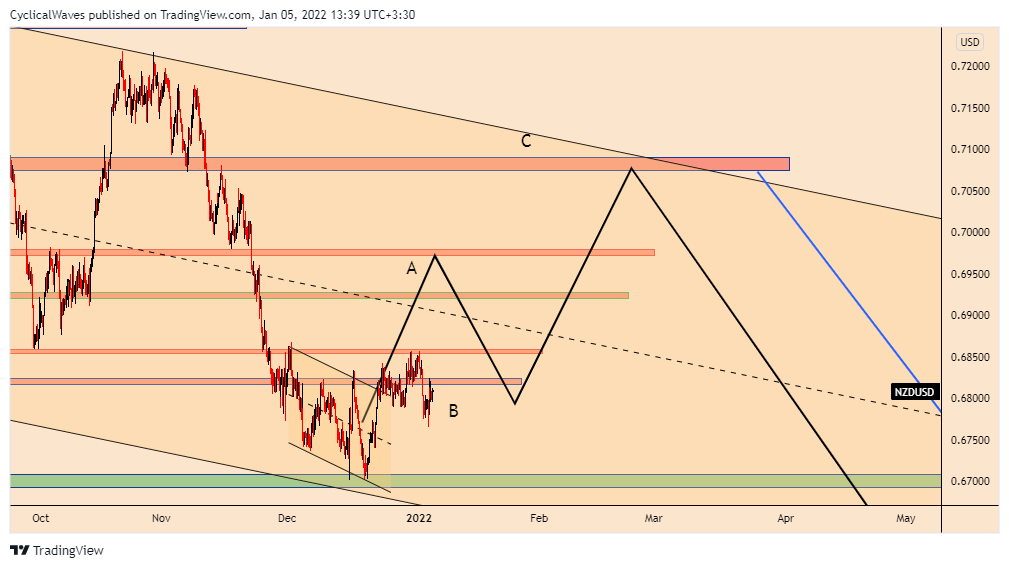 به نظر می رسد که به زودی اصلاح ABC بزرگ به پایان برسد و شاهد رشد نرخ باشیم. پس از پایان موج 5 از C به دنبال یک الگوی 123 خواهیم بود. در حال حاضر موج 3 از C به پایان رسیده است و در قالب یک مثلث متقارن در موج 4 هستیم که انتظار داریم به پایین بشکند. احتمال دوم اینکه در صورتی که مثلث و سپس سطح مقاومتی سرخ رنگ شکسته بشود، موج C را پایان یافته تلقی خواهیم کرد.