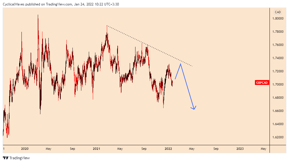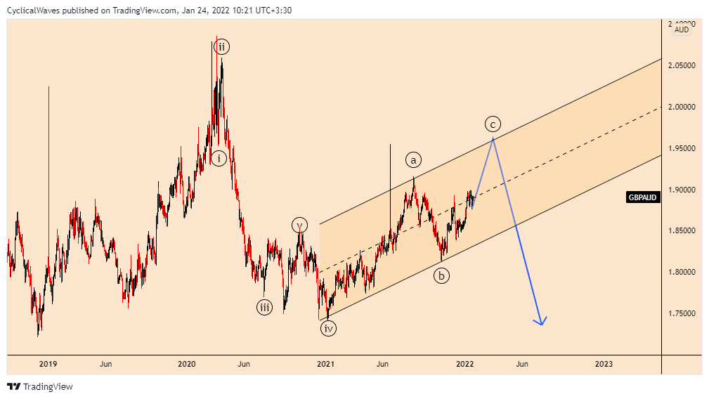 در چهارچوب کلی روند نزولی یک اصلاح صعودی در جریان بوده است. به نظر می رسد که احتمال وقوع یک بازوی اصلاحی صعودی دیگر برای موج C تا سقف کانال دور از ذهن نباشد.
