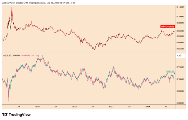 البته توجه کنید این همبستگی کامل نیست - عواملی مانند تفاوت نرخ بهره، قدرت دلار آمریکا، و احساسات ریسک می توانند مداخله کنند - اما همچنان یک معیار قابل اعتماد برای معامله گران است. به عنوان مثال، در سال های 2022-2023، در حالی که مس در بحبوحه تب انقلاب انرژی سبز افزایش یافت، AUDCAD همزمان با این نسبت روند صعودی داشت.